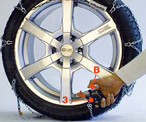 スノーチェーン装着前に自動増締めテンショナー(以下テンショナー)(3)のワイヤーが完全に巻き取られているかを確認してください。もし、ワイヤーが巻き取られていない場合は、テンショナー(3)をしっかりと握り、レバー(B)を「GO」の方向に押し込みワイヤーが完全に巻き取られたことを確認します。