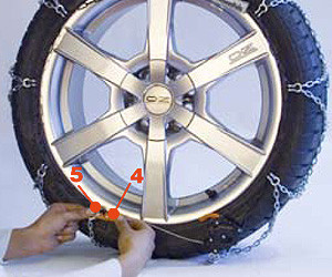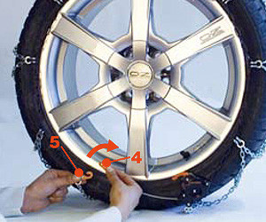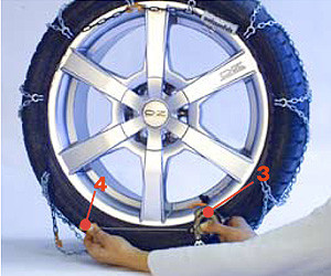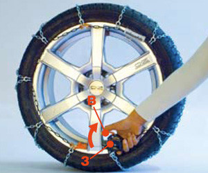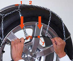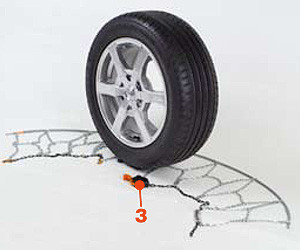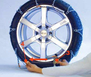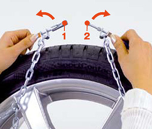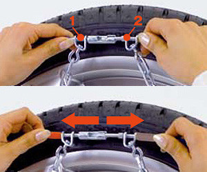 ケーブルの先端部(1)(2)を持って、タイヤの上部手前側に移動させ、結合してからしっかりひっぱり確実に連結させます。 |