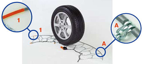 チェーンがねじれていないことを確認し、もつれないように広げ、ダブルフック(A)を上の写真のように、折り曲げた先端が下(地面側)になるように広げて置きます。 チェーンのケーブル先端部(1)を、タイヤの後ろ側に右から左に通します。 |