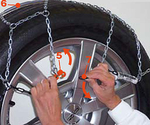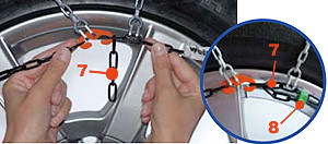 写真のようにサイドチェーン(7)を持って、ケーブル先端部(1)(2)がタイヤ上部手前側に来るまでしっかり引き出します。 |