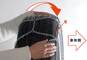 ケーブル(6)をタイヤの後ろ側に移動させ、ケーブル(6)がトレッド面(タイヤの踏面)にかからないようにします。 |