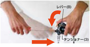 テンショナー(3)を持って、レバー(B)を『OPEN』(オープン)の方向へカチッと音がするまで、起こします。 |